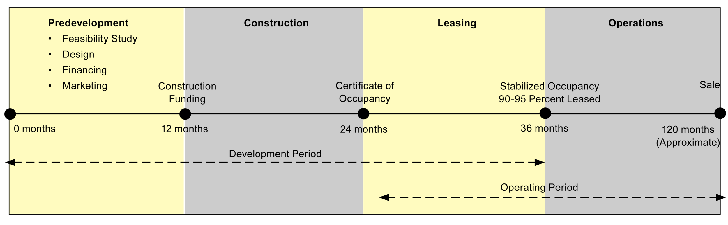 The six phases of the development process vary widely, depending to a project size, complexity, location, and complexity of the public approvals process. The diagram is derived from Professional Real Estate Development, by Professor Richard B. Peiser, Harvard University - Graduate School of Design